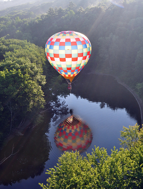 Hot-air balloon reflected in a river near Hillsborough, New Hampshire, USA